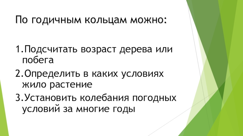 По годичным кольцам можно:1.Подсчитать возраст дерева или побега2.Определить в каких условиях жило растение3.Установить колебания погодных условий за