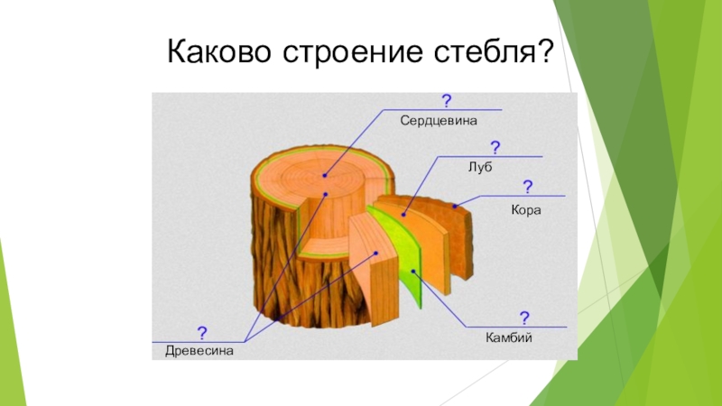 Каково строение стебля?КораЛубКамбийДревесинаСердцевина