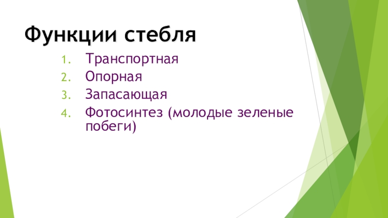 Функции стебляТранспортнаяОпорнаяЗапасающаяФотосинтез (молодые зеленые побеги)