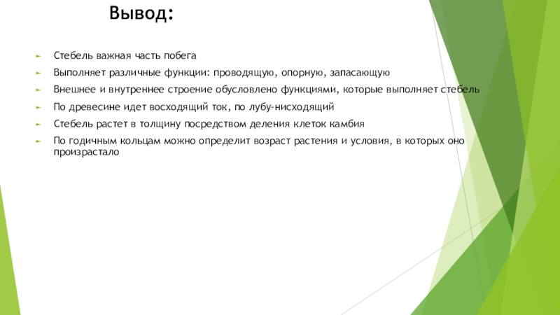 Вывод:Стебель важная часть побегаВыполняет различные функции: проводящую, опорную, запасающуюВнешнее и внутреннее строение обусловлено функциями, которые выполняет стебельПо