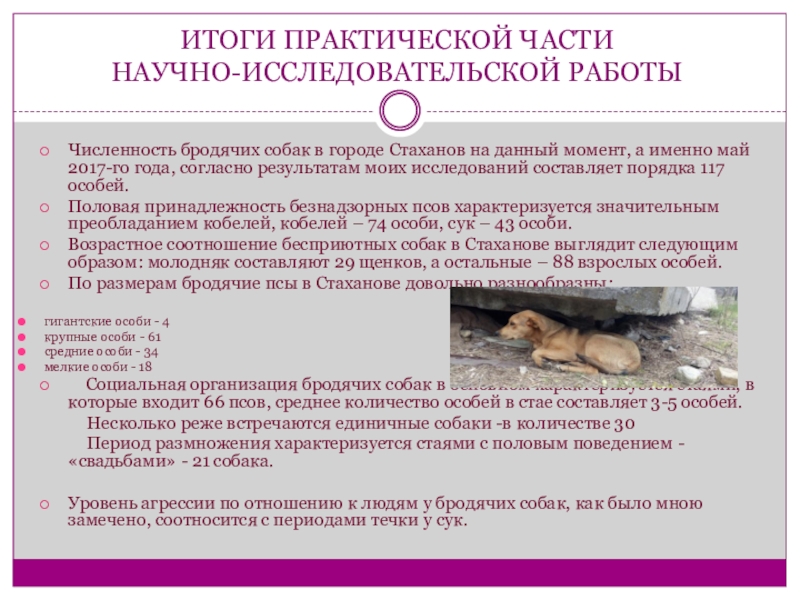 Как бы там ни было, к сожалению, с каждым годом численность бродячих собак неизменно увеличивается. И в этом я лично убедилась, проведя научно-исследовательскую работу на территории своего города.