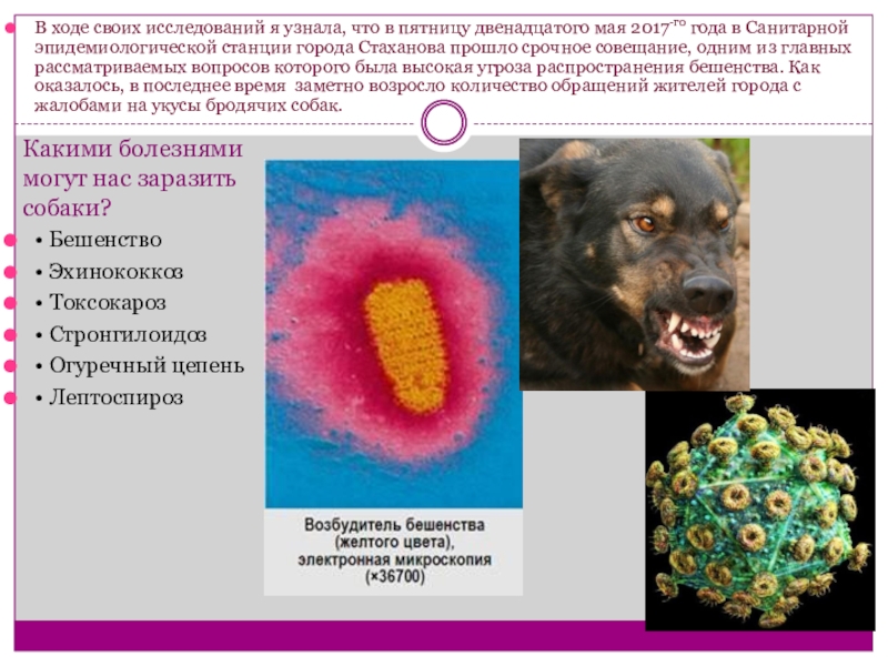 2017-го года в Санитарной эпидемиологической станции города Стаханова прошло срочное совещание, одним из главных рассматриваемых вопросов которого была высокая угроза распространения бешенства. Как оказалось, в последнее время заметно возросло количество обращений жителей города с жалобами на укусы бродячих собак.