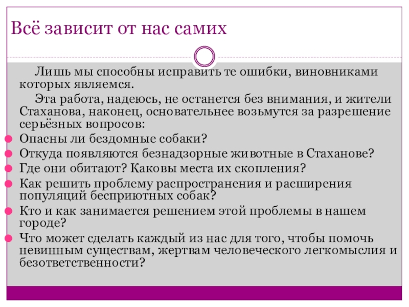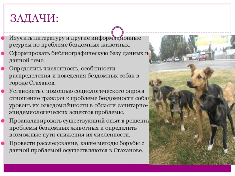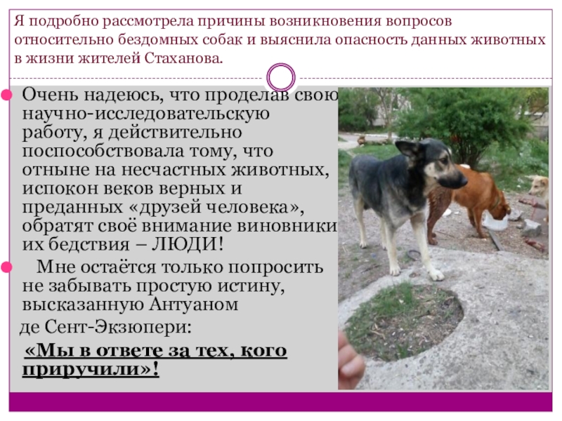 Я подробно рассмотрела причины возникновения вопросов относительно бездомных собак и выяснила опасность данных животных в жизни жителей Стаханова.