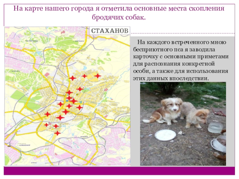 Слайд 11На карте нашего города я отметила основные места скопления бродячих собак.