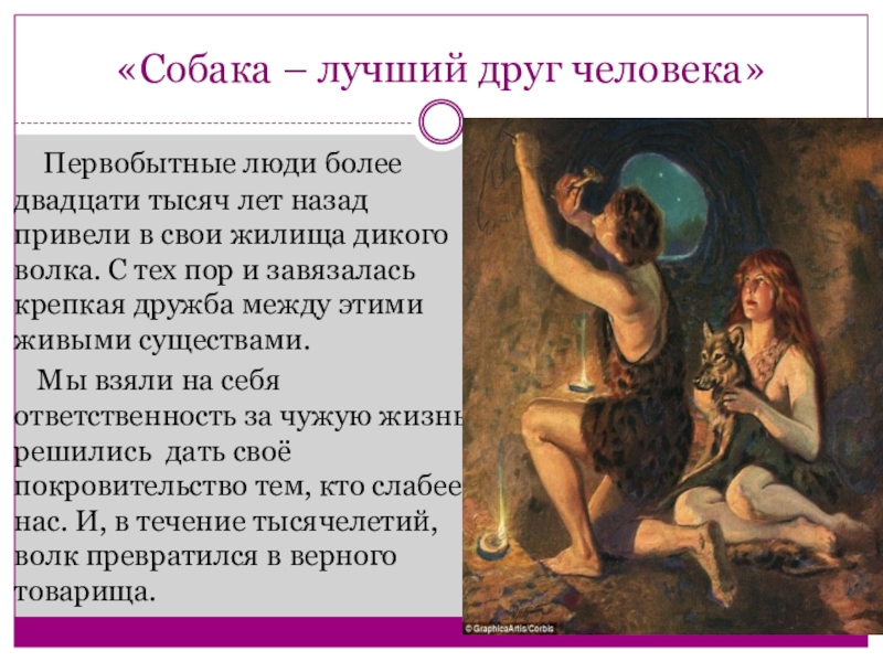 двадцати тысяч лет назад привели в свои жилища дикого волка. С тех пор и завязалась крепкая дружба между этими живыми существами.