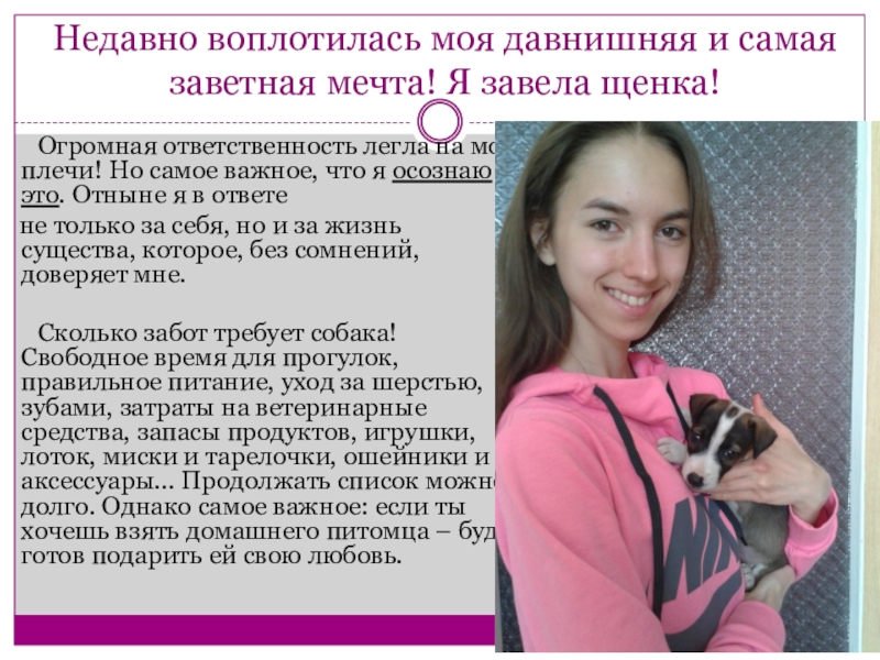 Слайд 8Недавно воплотилась моя давнишняя и самая заветная мечта! Я завела щенка!