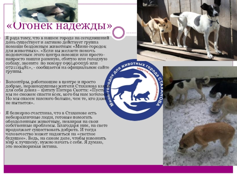 Волонтёры, работающие в центре и просто добрые, неравнодушные жители Стаханова взяли для себя девиз – цитату Питера Скотта: «Пусть мы не сможем спасти всех, кого бы нам хотелось. Но мы спасем намного больше, чем те, кто даже не пытается».