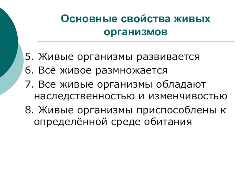 Основные свойства живых организмов5. Живые организмы развивается6. Всё живое размножается7. Все живые организмы обладают наследственностью и изменчивостью
