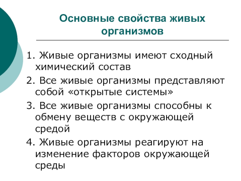 Основные свойства живых организмов1. Живые организмы имеют сходный химический состав2. Все живые организмы представляют собой «открытые системы»3.