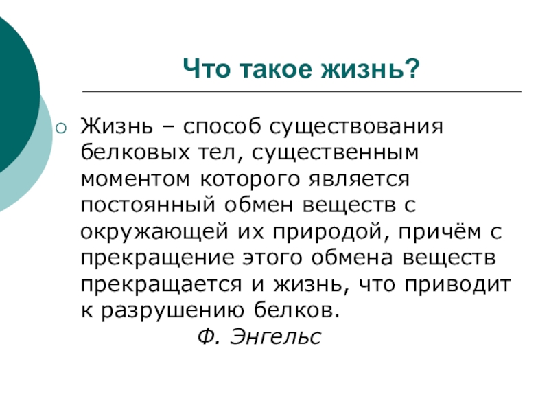 Что такое жизнь?Жизнь – способ существования белковых тел, существенным моментом которого является постоянный обмен веществ с окружающей