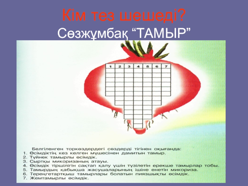 Слайд 9Кім тез шешеді? Сөзжұмбақ “ТАМЫР”