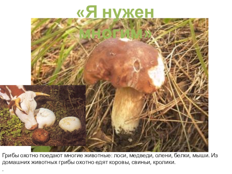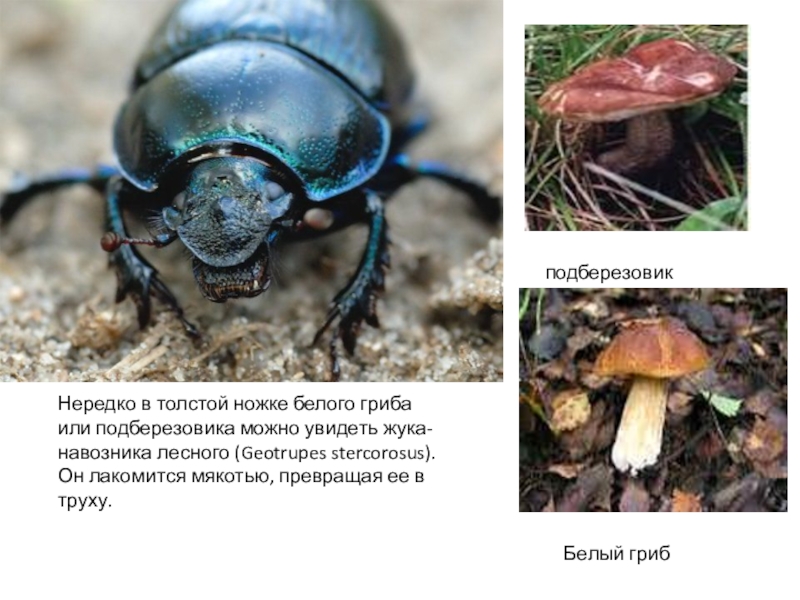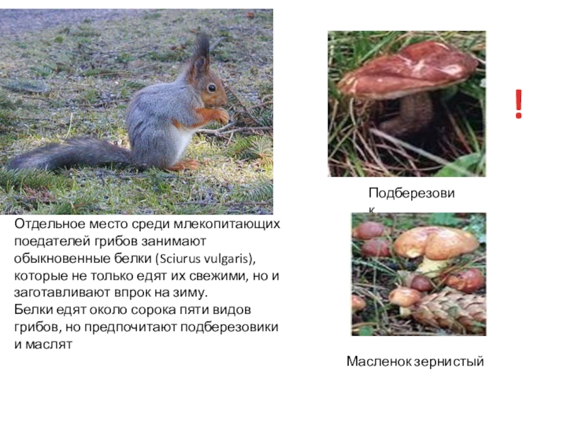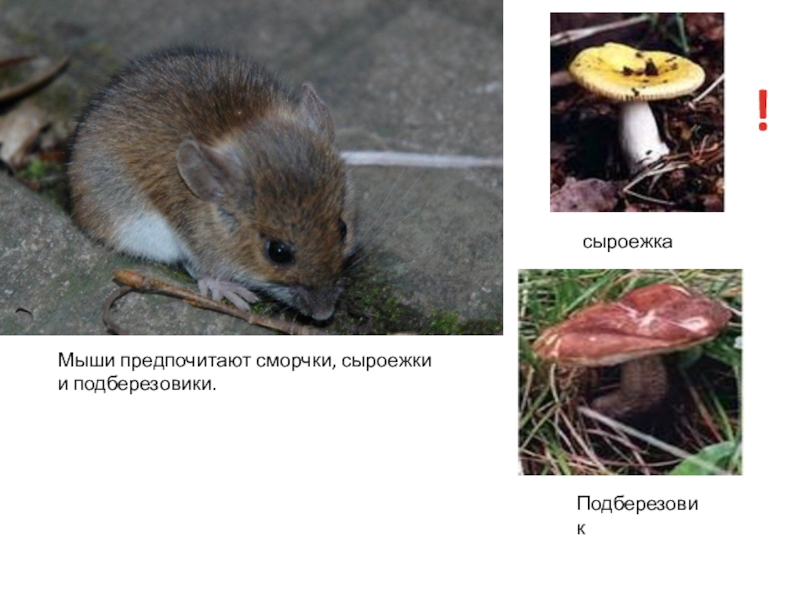 Мыши любят лакомиться грибами. На рисунке ниже показан белый гриб, объеденный сверху мышевидными грызунами — лесными рыжими полёвками. У белых грибов, подберезовиков они иногда начисто съедают ножку, так что цельная и свежая шляпка гриба оказывается лежащей прямо на земле.