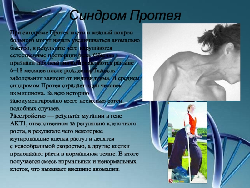аномально быстро, в результате чего нарушаются естественные пропорции тела. Обычно признаки заболевания не проявляются раньше 6–18 месяцев после рождения. Тяжесть заболевания зависит от индивидуума. В среднем синдромом Протея страдает один человек из миллиона. За всю историю задокументировано всего несколько сотен подобных случаев.