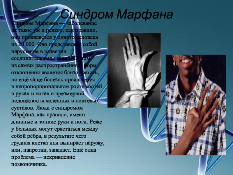 человека из 20 000. Оно представляет собой нарушение в развитии соединительных тканей. Одним из самых распространённых форм отклонения является близорукость, но ещё чаще болезнь проявляется в непропорциональном росте костей в руках и ногах и чрезмерной подвижности коленных и локтевых суставов. Люди с синдромом Марфана, как правило, имеют длинные и тонкие руки и ноги. Реже у больных могут срастаться между собой рёбра, в результате чего грудная клетка или выпирает наружу, или, напротив, западает. Ещё одна проблема — искривление позвоночника.