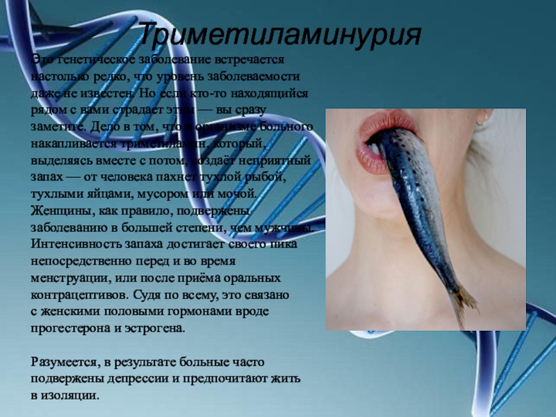 Но если кто-то находящийся рядом с вами страдает этим — вы сразу заметите. Дело в том, что в организме больного накапливается триметиламин, который, выделяясь вместе с потом, создаёт неприятный запах — от человека пахнет тухлой рыбой, тухлыми яйцами, мусором или мочой. Женщины, как правило, подвержены заболеванию в большей степени, чем мужчины. Интенсивность запаха достигает своего пика непосредственно перед и во время менструации, или после приёма оральных контрацептивов. Судя по всему, это связано с женскими половыми гормонами вроде прогестерона и эстрогена.