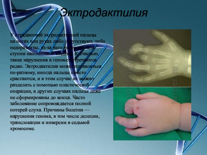 чего кисти рук или ступни напоминают клешни. К счастью, такие нарушения в геноме встречаются редко. Эктродактилия может проявляться по-разному, иногда пальцы просто срастаются, и в этом случае их можно разделить с помощью пластической операции, в других случаях пальцы даже не сформированы до конца. Часто заболевание сопровождается полной потерей слуха. Причины болезни — нарушения генома, в том числе делеции, транслокации и инверсии в седьмой хромосоме.