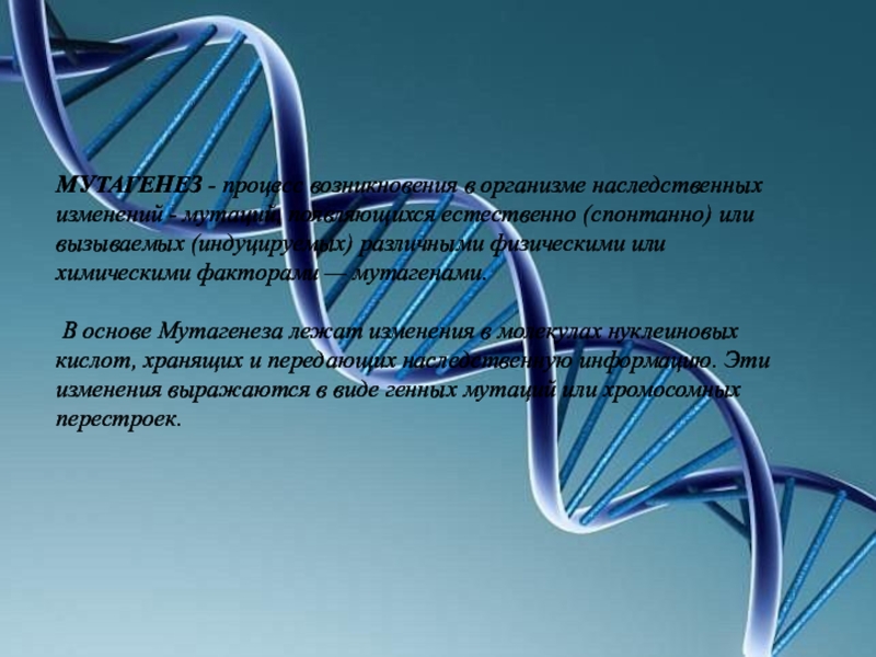 Слайд 2МУТАГЕНЕЗ - процесс возникновения в организме наследственных изменений - мутаций, появляющихся естественно