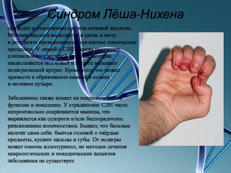 в результате происходящих в организме химических процессов. У людей с СЛН в кровь поступает слишком много мочевой кислоты, которая накапливается под кожей и в итоге вызывает подагрический артрит. Кроме того, это может привести к образованию камней в почках и мочевом пузыре.