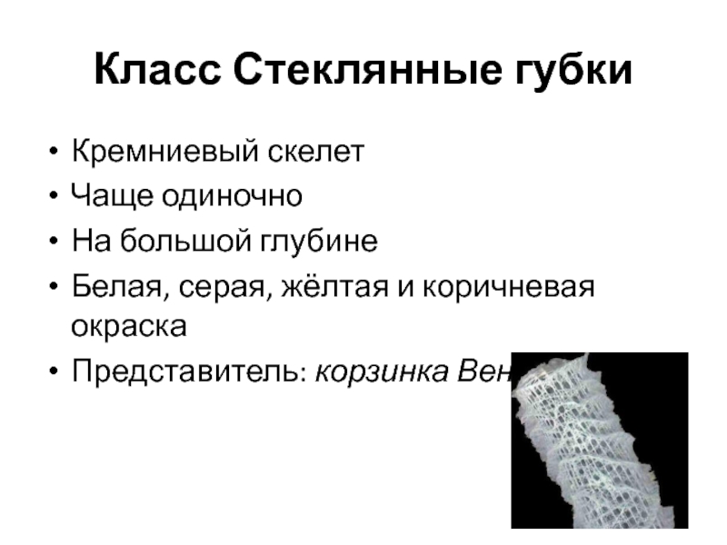 Класс Стеклянные губкиКремниевый скелетЧаще одиночноНа большой глубинеБелая, серая, жёлтая и коричневая окраскаПредставитель: корзинка Венеры