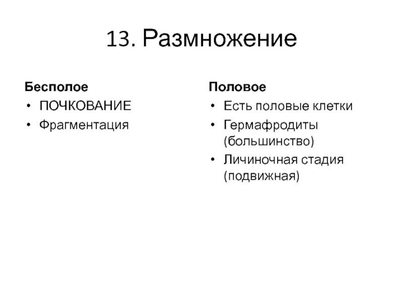 13. РазмножениеБесполоеПОЧКОВАНИЕФрагментацияПоловоеЕсть половые клеткиГермафродиты (большинство)Личиночная стадия (подвижная)