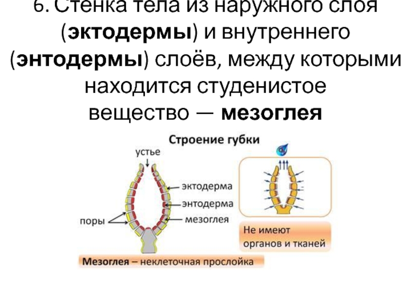 6.	Стенка тела из наружного слоя (эктодермы) и внутреннего (энтодермы) слоёв, между которыми находится студенистое вещество — мезоглея
