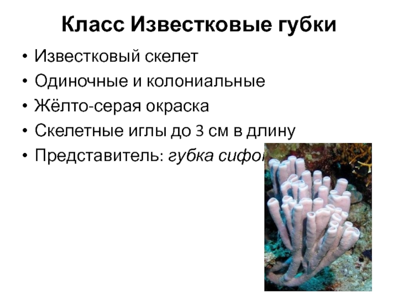 Класс Известковые губки Известковый скелетОдиночные и колониальныеЖёлто-серая окраскаСкелетные иглы до 3 см в длинуПредставитель: губка сифон