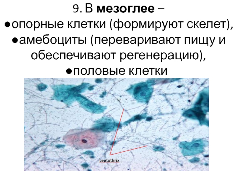 9.	В мезоглее – ●опорные клетки (формируют скелет), ●амебоциты (переваривают пищу и обеспечивают регенерацию), ●половые клетки