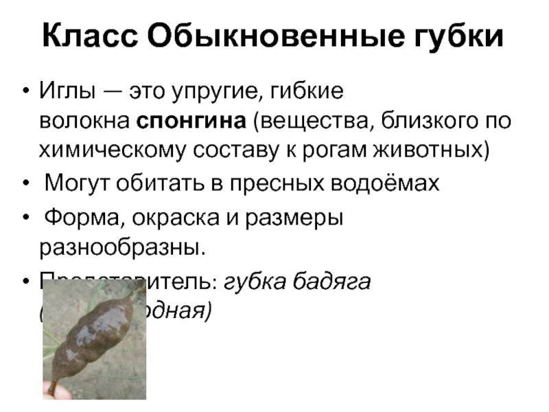 Класс Обыкновенные губкиИглы — это упругие, гибкие волокна спонгина (вещества, близкого по химическому составу к рогам животных) Могут обитать в