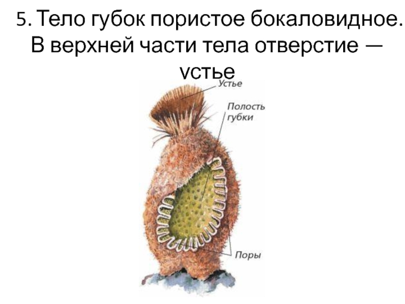 5.	Тело губок пористое бокаловидное. В верхней части тела отверстие — устье