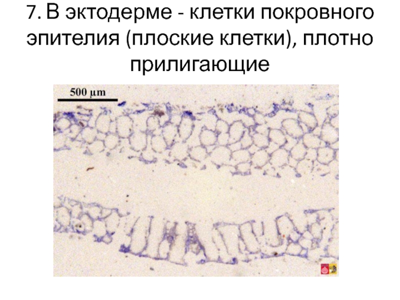 7.	В эктодерме - клетки покровного эпителия (плоские клетки), плотно прилигающие