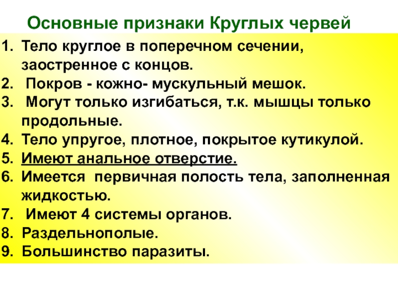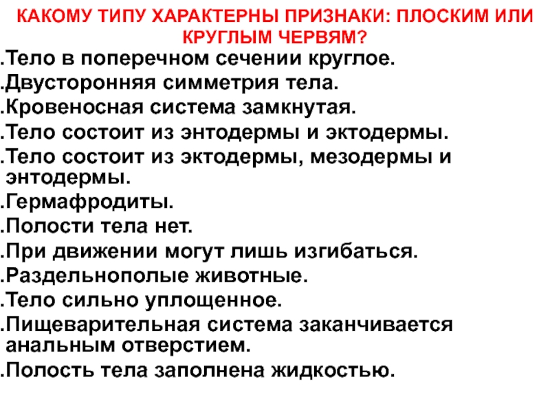 КАКОМУ ТИПУ ХАРАКТЕРНЫ ПРИЗНАКИ: ПЛОСКИМ ИЛИ КРУГЛЫМ ЧЕРВЯМ?