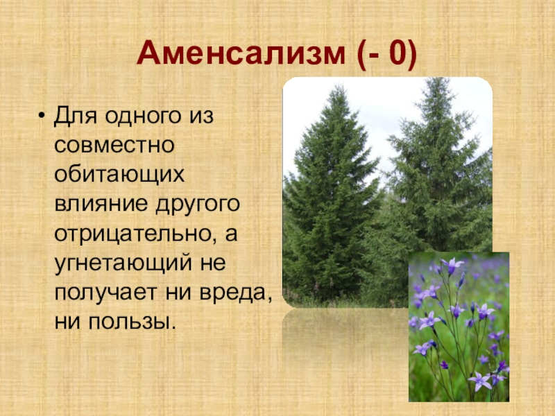 Аменсализм (- 0)Для одного из совместно обитающих влияние другого отрицательно, а угнетающий не получает ни вреда, ни