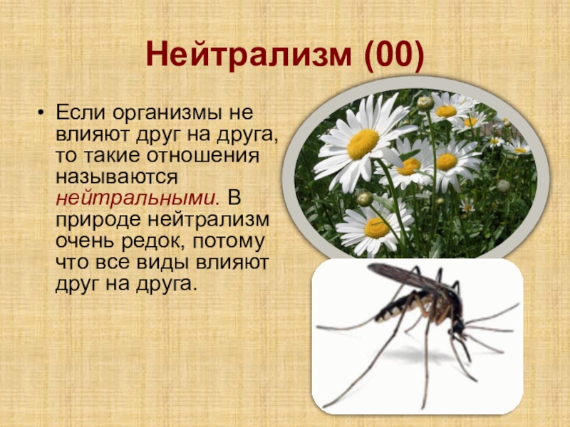 Нейтрализм (00)Если организмы не влияют друг на друга, то такие отношения называются нейтральными. В природе нейтрализм очень