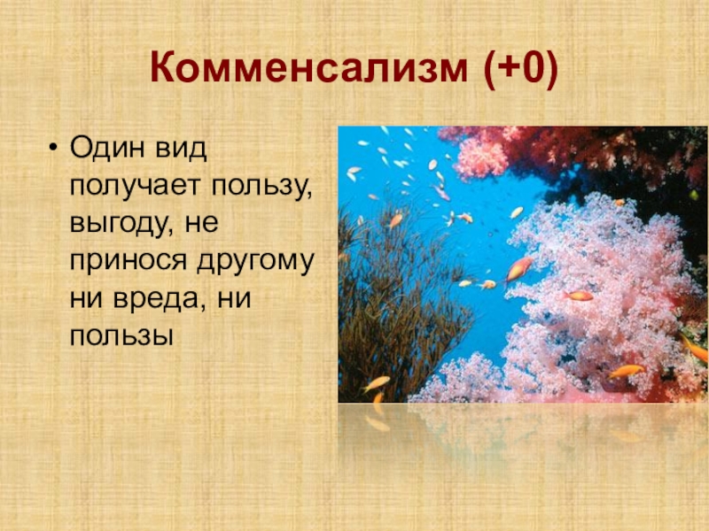 Комменсализм (+0)Один вид получает пользу, выгоду, не принося другому ни вреда, ни пользы