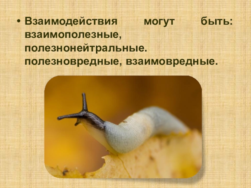 Слайд 2Взаимодействия могут быть: взаимополезные, полезнонейтральные. полезновредные, взаимовредные.