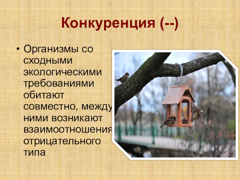 Конкуренция (--)Организмы со сходными экологическими требованиями обитают совместно, между ними возникают взаимоотношения отрицательного типа