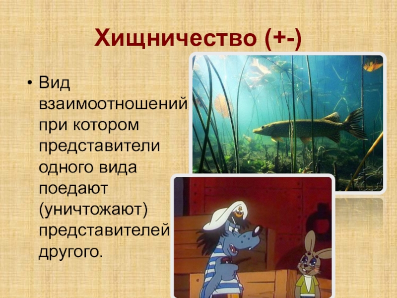 Хищничество (+-)Вид взаимоотношений при котором представители одного вида поедают (уничтожают) представителей другого.