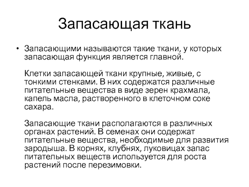 Также основные ткани отвечают за создание запасов органических веществ (в наибольшем количестве это крахмал) в самих растениях, а также в их семенах. Кроме питательных органических соединений может запасаться воздух и вода.
