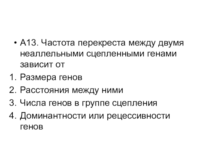 Слайд 14А13. Частота перекреста между двумя неаллельными сцепленными генами зависит от