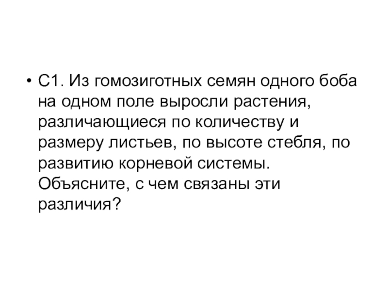 Слайд 49С1. Из гомозиготных семян одного боба на одном поле выросли растения,