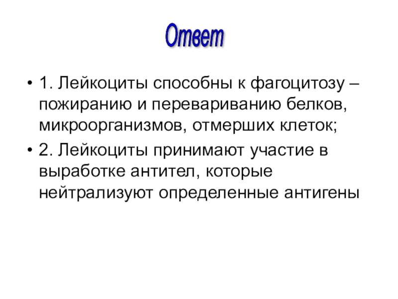 Слайд 481. Лейкоциты способны к фагоцитозу – пожиранию и перевариванию белков, микроорганизмов,