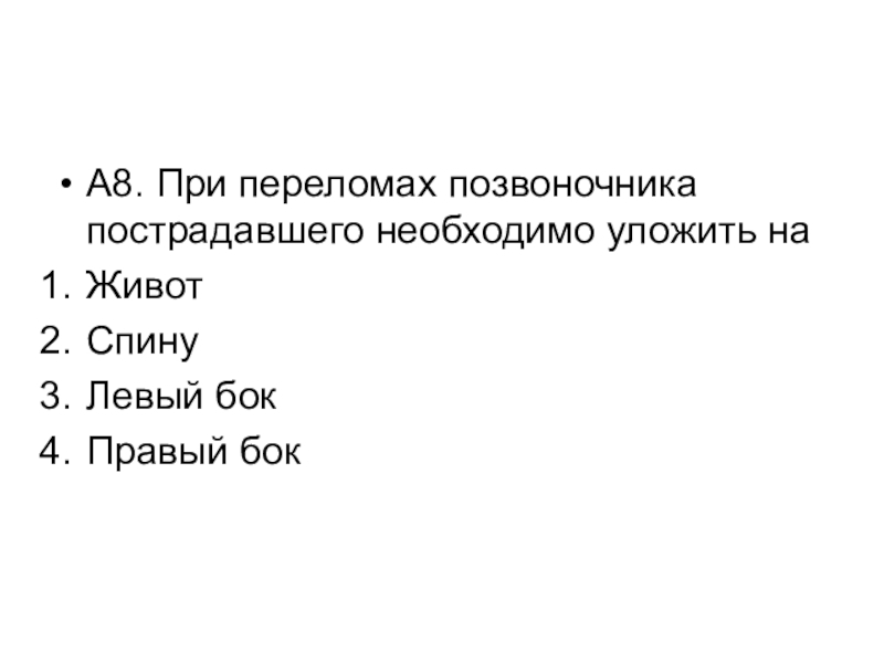 Слайд 9А8. При переломах позвоночника пострадавшего необходимо уложить на