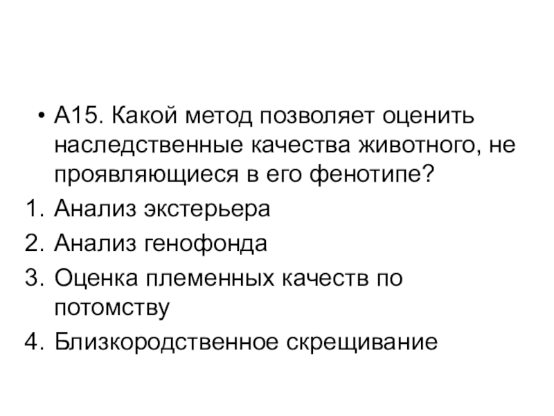 Слайд 16А15. Какой метод позволяет оценить наследственные качества животного, не проявляющиеся в
