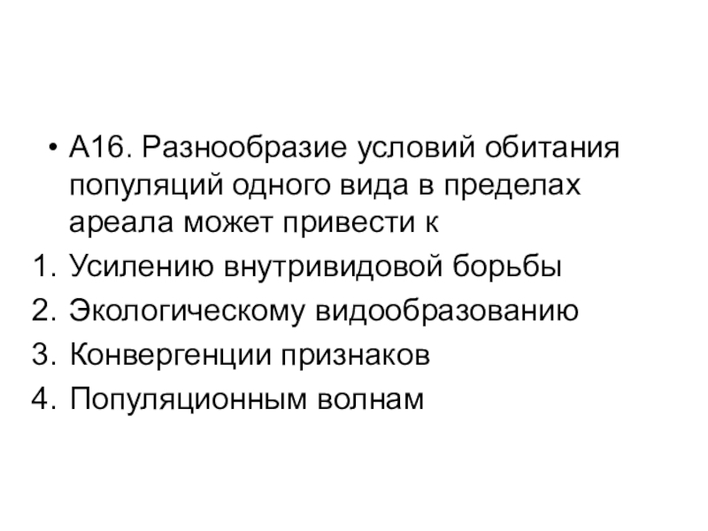 Слайд 17А16. Разнообразие условий обитания популяций одного вида в пределах ареала может