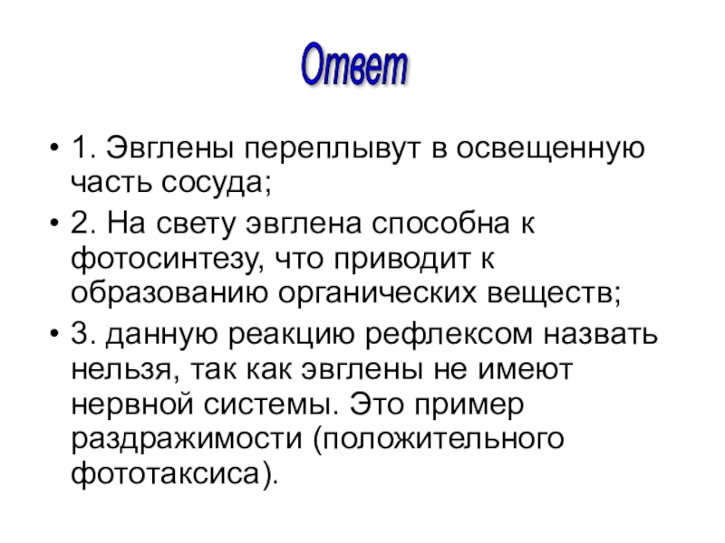 3. данную реакцию рефлексом назвать нельзя, так как эвглены не имеют нервной системы. Это пример раздражимости (положительного фототаксиса).