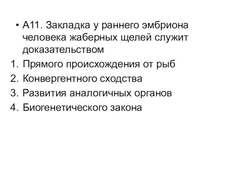 Слайд 12А11. Закладка у раннего эмбриона человека жаберных щелей служит доказательством