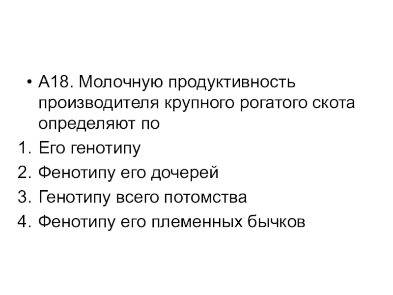 Слайд 19А18. Молочную продуктивность производителя крупного рогатого скота определяют по