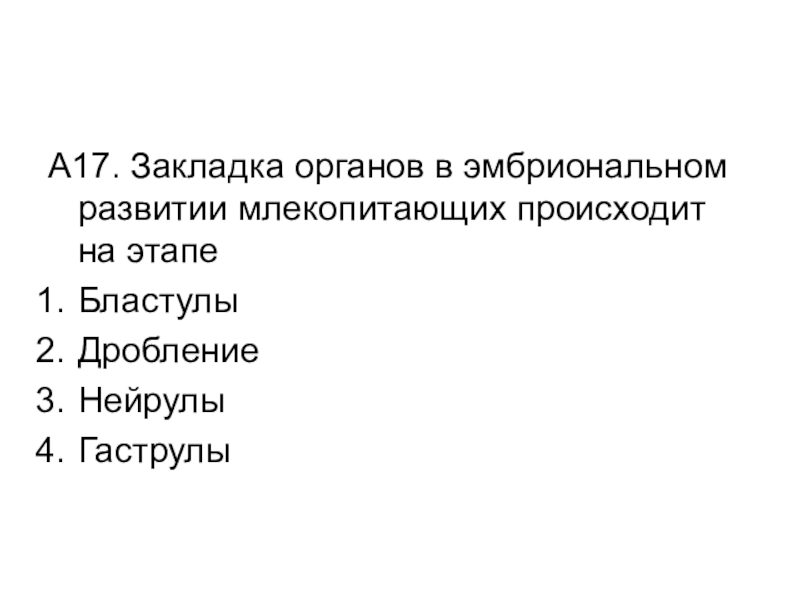 Слайд 18А17. Закладка органов в эмбриональном развитии млекопитающих происходит на этапе