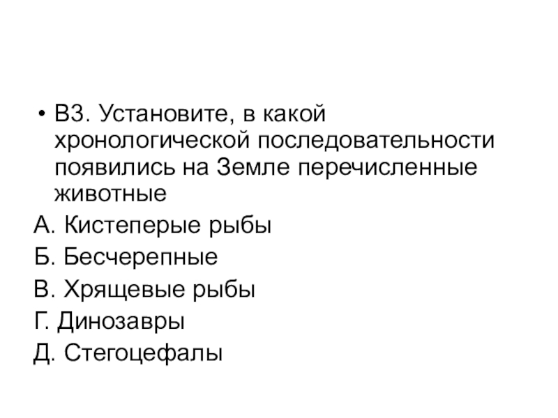 Слайд 24В3. Установите, в какой хронологической последовательности появились на Земле перечисленные животные
