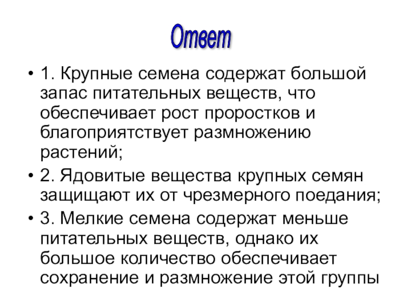 Слайд 341. Крупные семена содержат большой запас питательных веществ, что обеспечивает рост